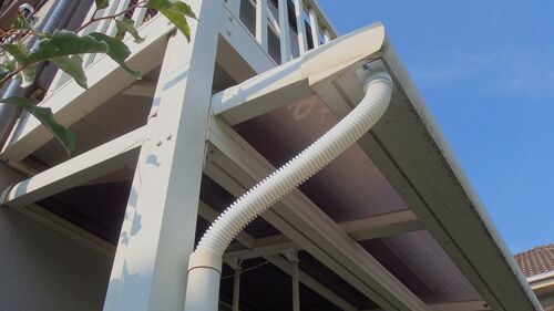 テラスの屋根からの蛇腹ホースで雨水を流す縦樋と写真では柱に隠れている バルコニーからの雨水を流す縦樋がある テラス屋根の雨水とバルコニーからの雨水は畑への通路に流れていた このため畑への通路は雨が降るとぬかるむので余っていた テラス屋根の雨水…
