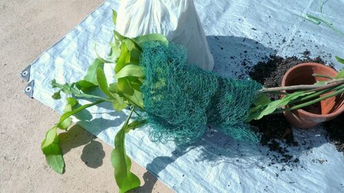 鉢植えの月下美人の土は2年が経過したので土替えをします 鉢の支柱を取り伸びた月下美人のシュートと葉が扱いやすいように養生ネットを巻いて 土と鉢の境目周囲にスコップを差し込み、月下美人の株を土ごと鉢から抜き取ります 根の土を落とし痛んだ根、古い…