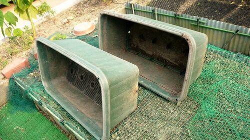 野菜用のプランターの土替え 畑にビニールシートを広げてその上にプランターをひっくり返して空にする 空になったプランターを乾燥させる 畑に敷いたビニールシートにプランターの土を広げて夏野菜の根や害虫を取る 土の上のネットはネコがトイレに来るのを…