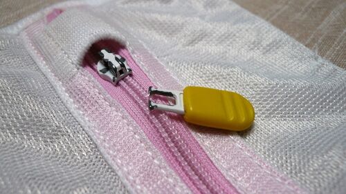 洗濯ネットのロック付きファスナーのスライダー引手が洗濯中に外れて、 ファスナーのロック付きスライダーが動かない、ネットの中の洗濯物を取り出したいが ロック機構付きファスナーのためスライダーが開けられない スラ―ダーの穴につま楊枝を差し込んでみ…