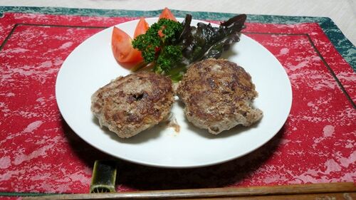 牛肉ミンチ200g、玉ねぎ1/4のみじん切りと牛乳で湿らせたパン粉4、 玉子1個と塩、黒コショーをボールに入れよくツヤが出るまで手で握り こね合わせ4等分して両掌に交互にたたき付けて空気を抜いて皿に丸めて 焼くまで冷蔵庫へ ジャコ御飯とハンバー…