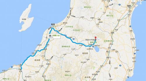 南東北ベストハイライトツアーのルートマップ (Google Map) 8月24日 北陸新幹線の上越妙高駅から裏磐梯の五色沼へ 上越自動車道、北陸自動車道は柏崎、燕市、三条市、新潟から弁悦自動車道を走り 阿賀野川SAで休憩、福島県の裏磐梯、五色沼、宿泊先、裏…