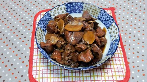 酒のあてに鶏のもつ肝煮込みをつくりました。 鶏の肝煮 ショウガ、国産若鳥の砂肝、鶏の肝(心臓とレバー) 砂肝は水で洗って半分に切り、鶏の肝(心臓とレバー)は心臓とレバーを切り離し、心臓の周りの脂肪を取り、縦に切目を入れ中の血溜まりを揉むように…