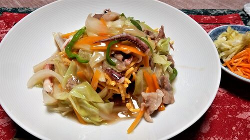 皿うどんいつもはマルタイ食品の袋入り細麺を使いますが、同じメーカーの空洞太麺皿うどんが売られていたのを買ってきて調理してみました。 イカゲソ ピーマン 玉葱 キャベツ 人参 豚肉の入ったあんをかけた皿うどん 具材を炒め分量の水と付属のソースを入れ…