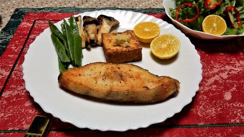 カラスカレイのムニエル、 平豆とエリンギ、厚揚げと自家製スダチ ロシア産カラスカレイ(冷凍) 日本酒をかけて洗い、小麦粉をふってから カラスカレイをフライパンでムニエルにします 平豆を適当な長さに切り、べつのフライパンでソテーします 厚揚げもフ…
