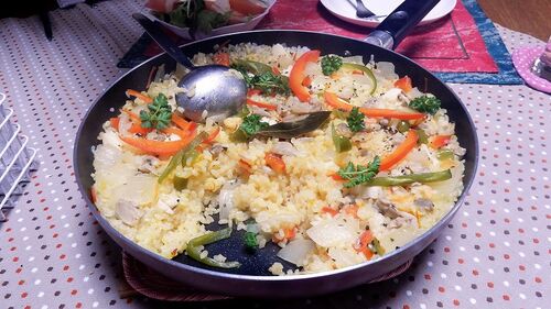 ドイツの息子が一時帰国中、シーフードパエリアをつくりました シーフードパエリア サフランの黄色い色も出ています シーフードミックスの入ったシーフードパエリア シーフードパエリア 鶏肉も加え入れたパエリアです