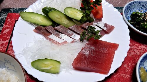 刺身定食にしました 生マグロとハマチの刺身 アボカドの刺身風 魚の刺身と同じようにワサビ醤油で食べると美味しいです かぼちゃの煮付 ほうれん草のお浸し 刺身定食