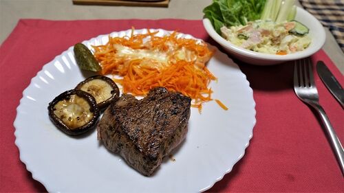 夕食は、厚切りタスマニアンビーフのモモ肉ステーキとポテトサラダ タスマニアンビーフのモモ肉ステーキ 添えは人参のチーズ焼きとピクスス、焼きシイタ ポテトサラダ ガーリックチップ 厚切りモモ肉ステーキ 昼食は半田そうめん 半田そうめん 麺つゆは、鍋…