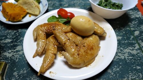 手羽先と南瓜、まる天、シシトウの煮込みとモロヘイヤです 手羽先の煮込み 野菜と丸天の煮込み カボチャと丸天の煮込み モロヘイヤ
