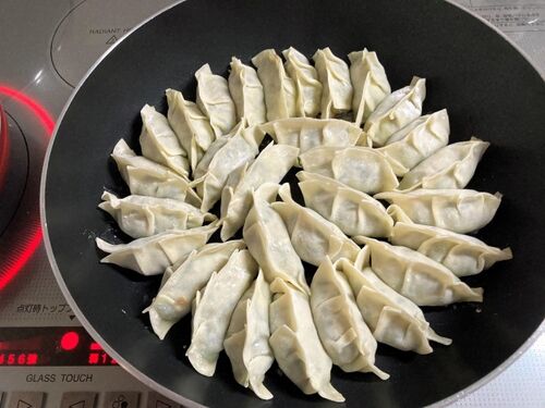 豚ひき肉に味付けをしてよく練り合わせてから、白菜とニラ、ニンニク、生姜を加えザックリ混ぜ合わせ、ラップを密着させてしばしねかせてから、餃子の皮に包み込む。油を引いたフライパンに並べて焼き開始、そこに色が付くまで焼いてから、熱湯を入れて蓋を…