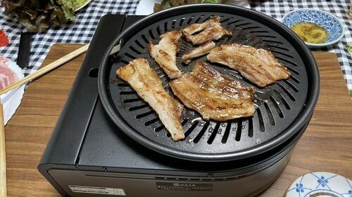 サムギョプサルに出来る豚肉が安売りされていた、3ブロック買って切り分け、サムギョプサルに使う分いがいの肉は冷凍庫へ保存しておきました。 サムギョプサル 豚肉 焼丸くんと下準備 タマネギとニンニクを焼いた後、肉を焼きます サニーレタスに肉とニンニ…