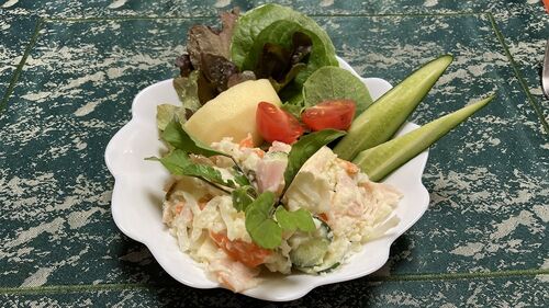 ポテトサラダとローストチキンにモヤシ炒めです ポテトサラダ ポテトサラダ、キュウリ、ミニトマト、リンゴ、ルッコラ、ミックスレタス ローストチキンとモヤシ炒め ロールパンにポテサラとローストチキンを挟んで