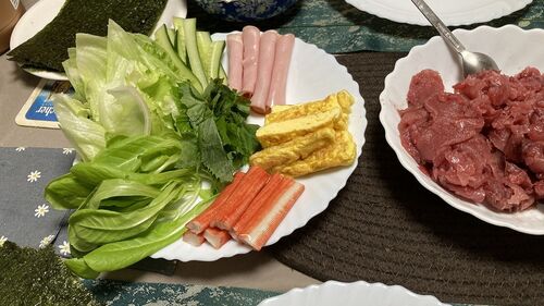 スーパーで売られていた生マグロの中落3枚入りパックを400円ちょっとで購入し、マグロの骨周りの肉をスプーン(肉薄の計量スプーン)でこそげ取ると深皿いっぱいの生マグロがととれたのを、卵焼き、ハム、キュウリ、レタス、サラダ菜、青じそ、カニボコで…