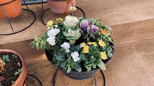 11月も後半になると気温も下がり風も寒く感じる季節になりました。 ビオラとミニ葉ボタンの寄せ植え ビオラの鉢植