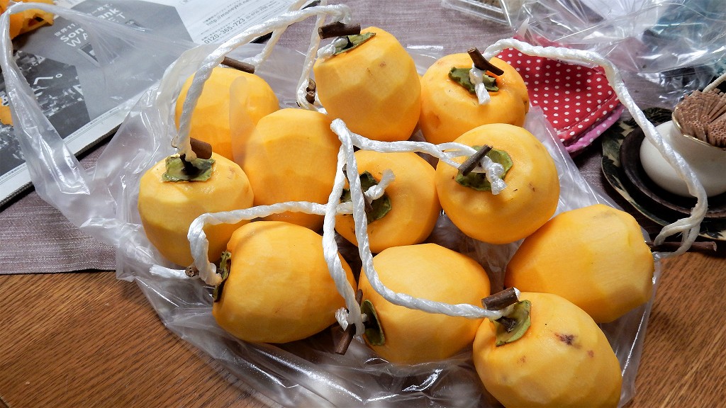 2017-11-14 干柿 料理 気温も下がってきたところで渋柿を干し渋抜きをして干し柿にすことにした あたご柿を2袋12個買ってきてを柿の皮むき 柿のヘタの余分なところは切り落とし、先端部分の皮は少し残しておきます 包丁でむいた柿の皮、田舎では干して置きたくわん漬けに漬け込んでおりましたが 吊るす紐に通して 鍋の熱湯に10秒くらい紐ごと浸して殺菌(一荷づつ鍋に入れ煮沸を保ち殺菌した) 和室の軒下に吊るす 雨がかかると腐るので、雨のかからないところに吊るしました