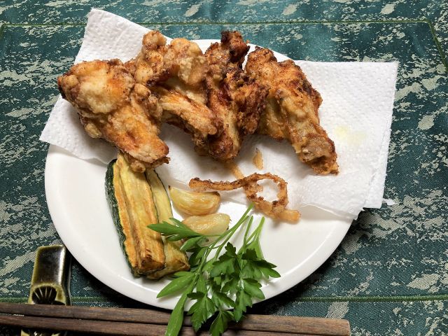 2022-04-24 鶏手羽元の洋風から揚げ 料理 今日は朝から雨、午後には小ぶりなりました。 鶏の手羽元、骨のそって切り目を入れて、牛乳をはったパッドに処理した手羽元、タマネギの輪切りを入れ、塩コショウをしてしばらく浸けて置いてから、キッチンペーパーで汁気を拭き取り、粉をつけて油で洋風にから揚げしてあります。 鶏手羽元の洋風唐揚げ 生野菜、キャベツ、キュウリ オキアミの揚げ玉 鶏手羽元の洋風唐揚げ3本 タマネギとズッキーニ、ニンニクを上げて添えました 赤飯