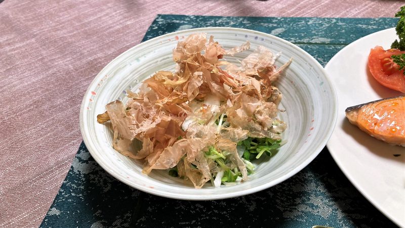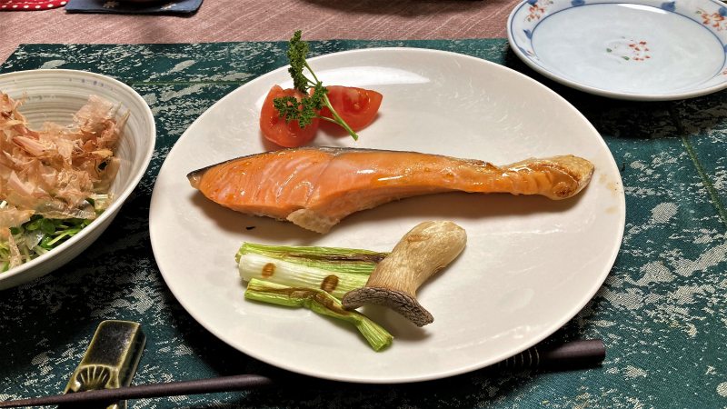 2023-02-24 ニラ玉子焼き 昨日は玄関内のメダカの水槽の水替えをし、綺麗になった水槽内でメダカが楽しんでいるかのように泳いでいます。 今日は朝から冷たい雨が降っており、外出しておりません、家でクロスパズルをしたりしておりました。 ニラ玉子焼き サーモンの塩焼き カイワレ大根にかつお節