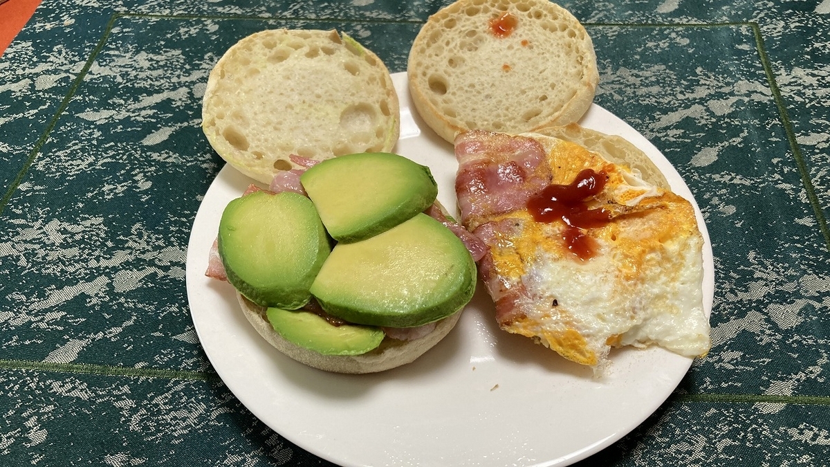 2023-05-23 イングリッシュマフィンでバーガー イングリッシュマフィンでバーガーを作りいただきました。 昨日は暑いくらいの天気でしたが、夜に雨が降り低気圧が通過し、今日は朝から寒く長袖のシャツを着て郵便局とスーパーに買い物に行ってきました。 イングリッシュマフィンバーガー トースターで温めたアボカドとフライパンで焼いたベーコン、卵とベーコン