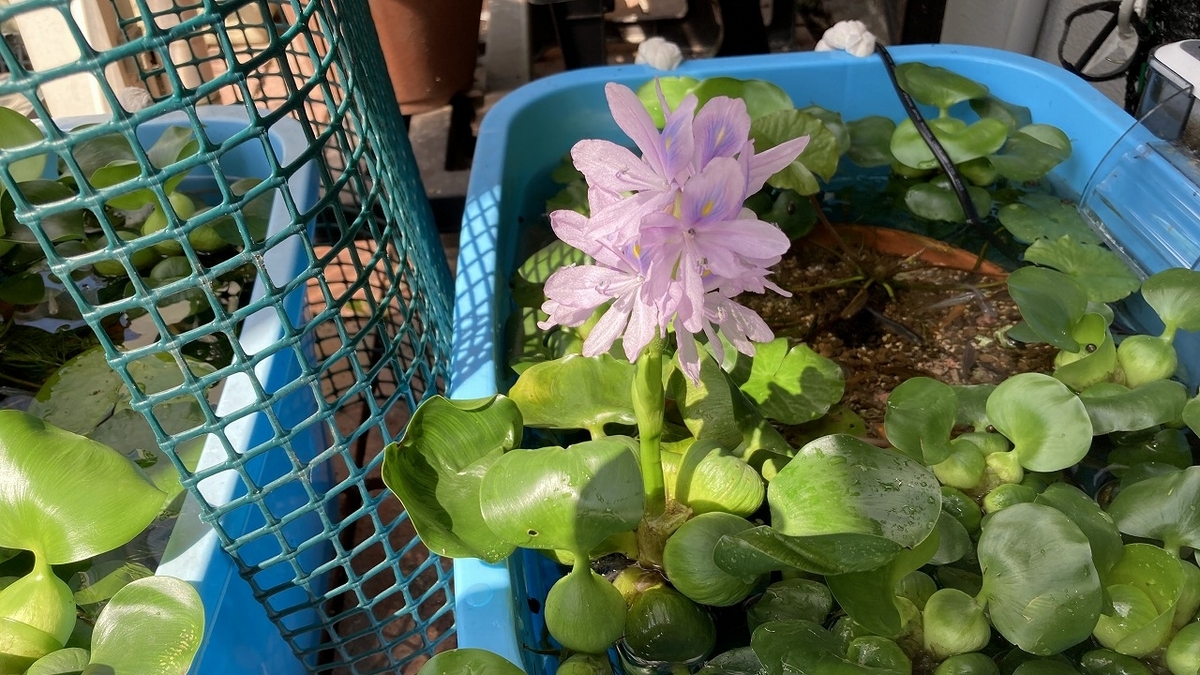 メダカの水槽の布袋草に花が咲きました。